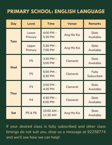 I had classes with Ms. Michelle from P4-P6. My compositions went from 27/40 to 38/40 and now full marks in my secondary school essays, and it was the first time 10 year old me ever looked forward to having extra classes outside of school. Ms. Michelle is a wonderful, humorous, kind, and caring person, and one of the best teachers I’ve ever had the privilege of having. You can tell she genuinely cares very deeply for her students and tries her best for each and every one of them. I will forever be grateful for what she's done for me.
